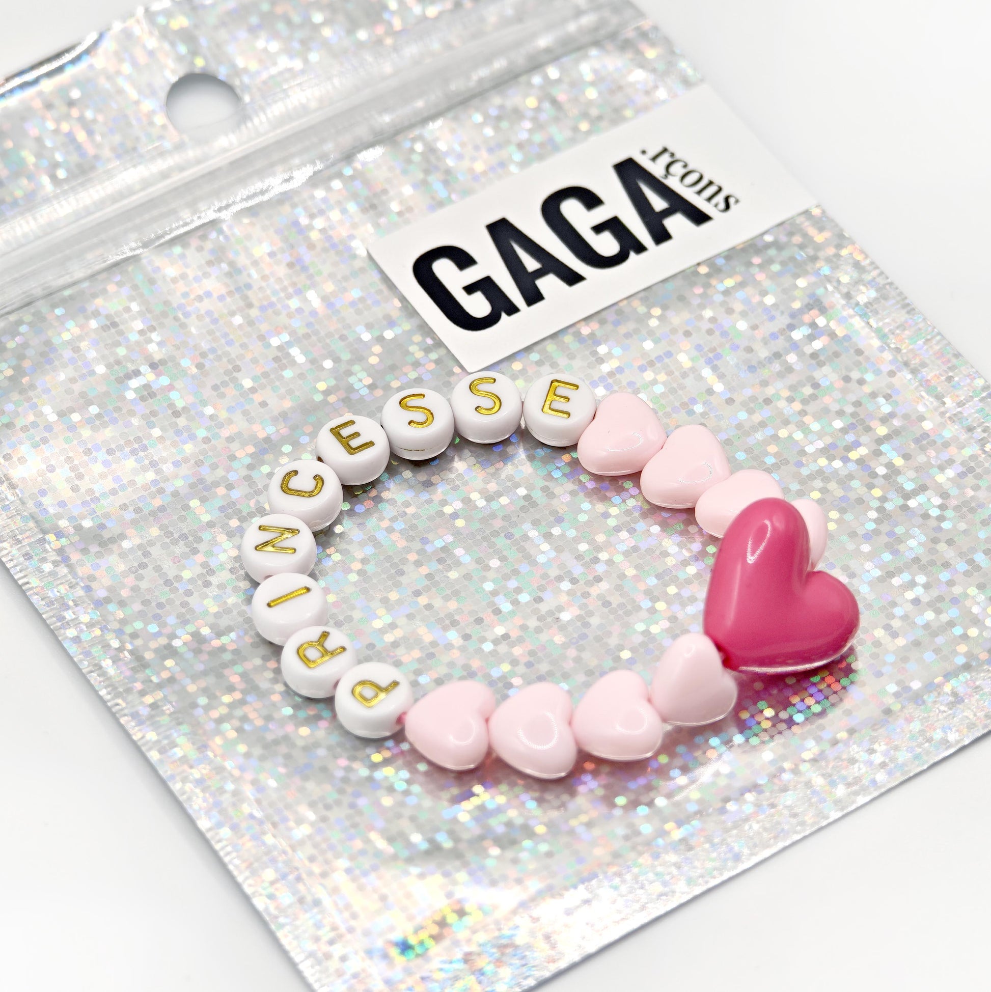 Bracelet GAGA - Rose pastel, Blanc doré & Maxi coeur Fuchsia