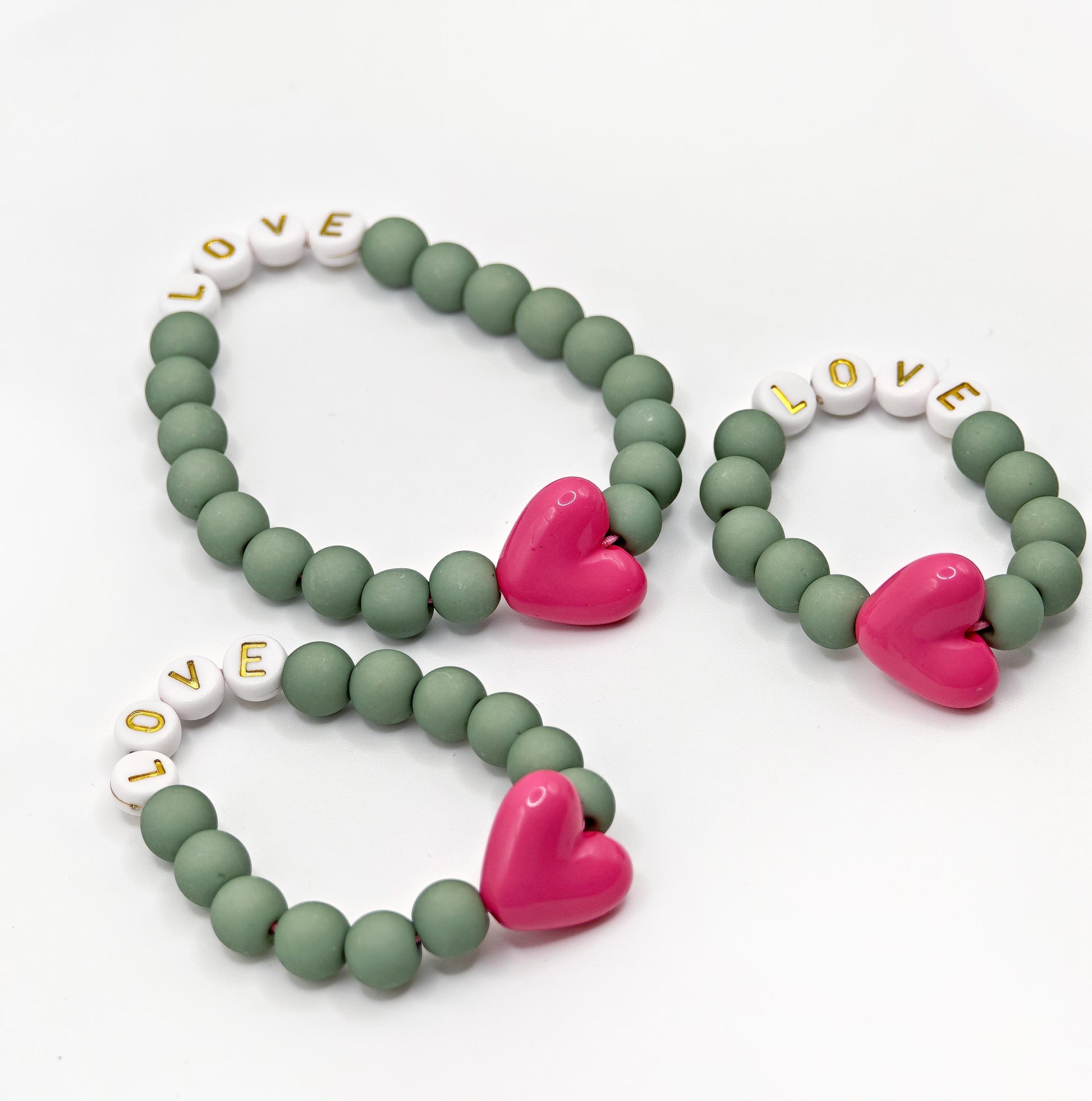 TRIo de Bracelets - Matcha, Blanc doré & Maxi coeur Fuchsia (1 adulte + 2 enfants)
